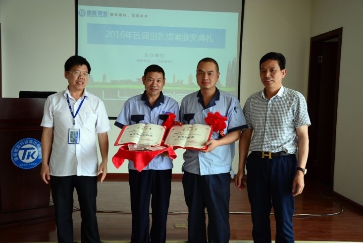 ? ? ? ?會上,林總裁和生產(chǎn)總監(jiān)洪青成對線管車間“3號、4號自動混料機創(chuàng)新和能源節(jié)約改善”、“3號、4號塑料機由人工改為自動化系統(tǒng)”兩個創(chuàng)新項目進行了表彰。獲表彰的線管車間主任羅陽明代表獲獎單位作了發(fā)言。