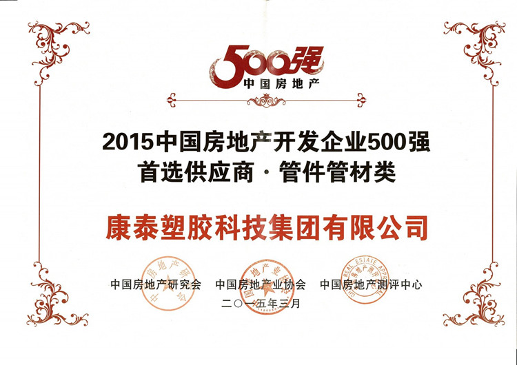 ?????? 日前,“2015中國房地產(chǎn)500強(qiáng)測評(píng)成果發(fā)布會(huì)暨500強(qiáng)峰會(huì)”在北京國貿(mào)隆重舉行。值得恭賀的是,康泰集團(tuán)首次入圍“地產(chǎn)500強(qiáng)首選供應(yīng)商 管件管材類”榜單,獲得了由中國房地產(chǎn)研究會(huì)、中國房地產(chǎn)業(yè)協(xié)會(huì)和中國房地產(chǎn)測評(píng)中心聯(lián)合頒發(fā)的“2015中國房地產(chǎn)開發(fā)企業(yè)500強(qiáng)首選供應(yīng)商品牌”榮譽(yù)證書。